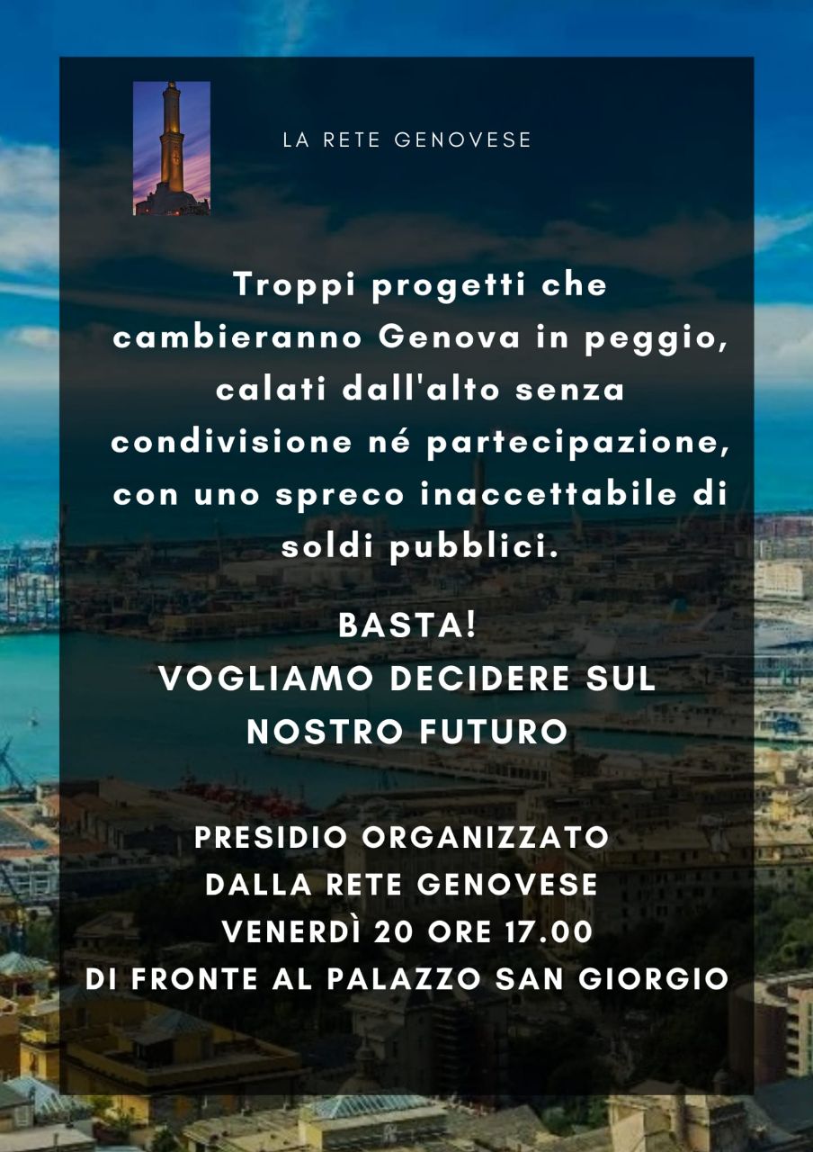 Venerdi 20, dalle ore 17.00, davanti a palazzo S. Giorgio, la Rete Genovese (insieme di 38 comitati e associazioni genovesi) di cui fa parte anche la nostra associazione organizza un presidio in concomitanza all’evento “Alfabeto del futuro” alla quale parteciperanno il Sindaco di Genova Marco Bucci ed il Presidente della Regione Liguria Giovanni Toti.