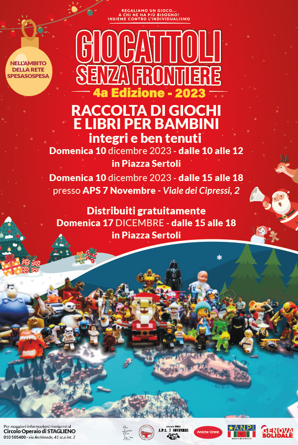 Per il quarto anno consecutivo insieme a GenovaSolidale, Arci 7 novembre – Archivio Bibliografico della Resistenza “Michele GINO Campanella” e al Circolo Sertoli abbiamo organizzato la raccolta e la distribuzione del giocattolo sospeso!