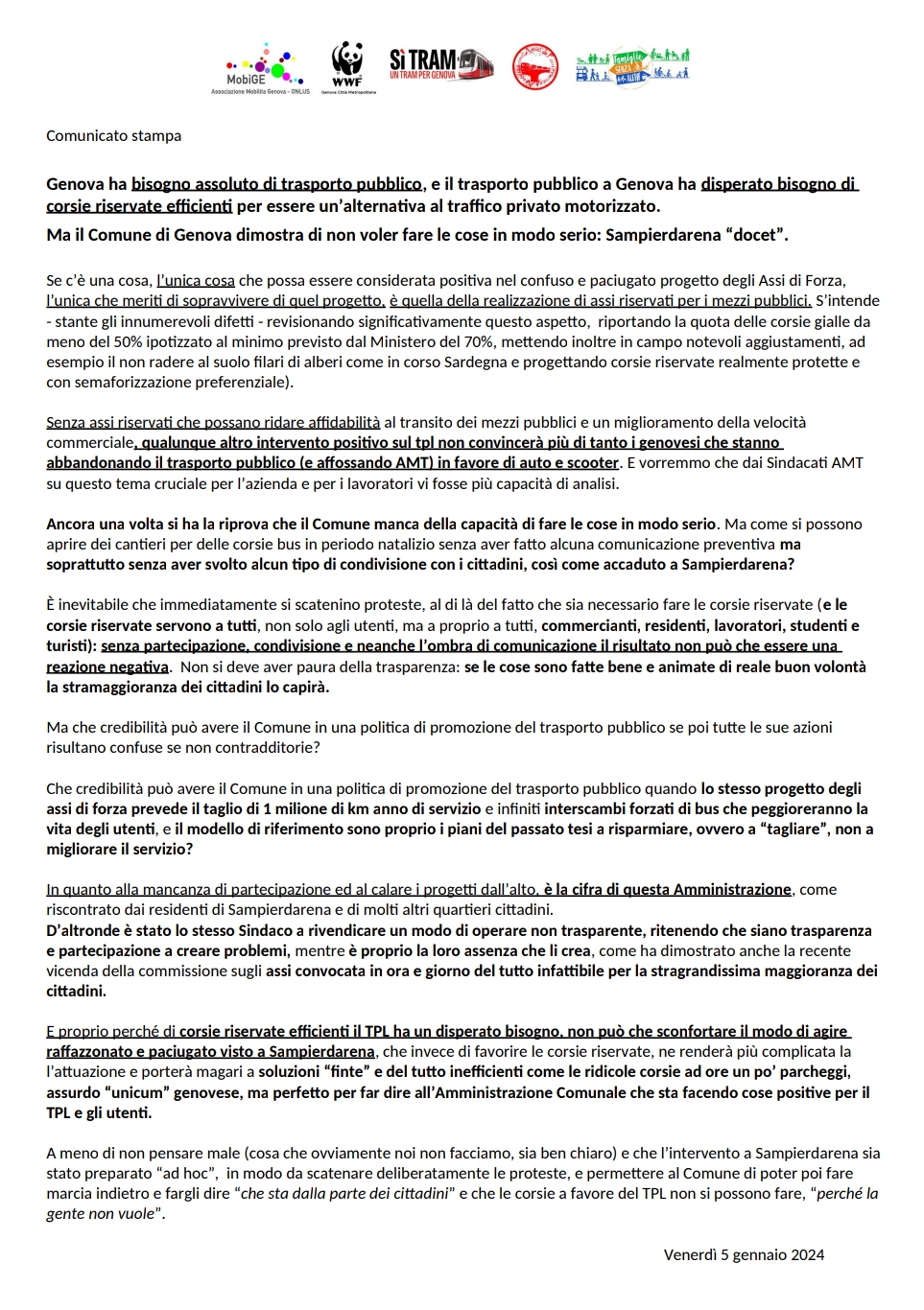 Comunicato stampa sulle corsie riservate