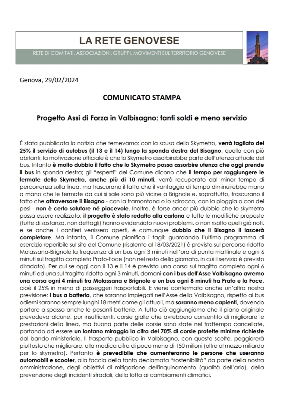Comunicato stampa del 29/2/2024: progetto assi di forza in Val Bisagno – tanti soldi e meno servizio